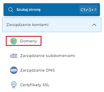 - W panelu wejdź w zakładkę Zarządzanie kontami a następnie wybierz Domeny.